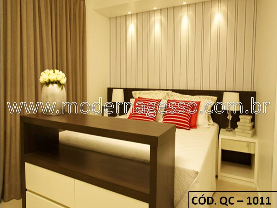 Para que coubesse a cama grande e o móvel neste quarto, foi feita uma reentrância na parede de drywall, formando uma cabeceira invertida que liberou 10 cm no ambiente. Iluminação interna e um papel de parede claro deixam essa cabeceira charmosa, dando requinte ao ambiente.